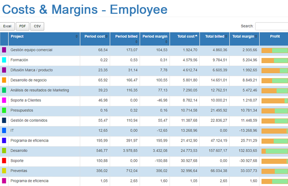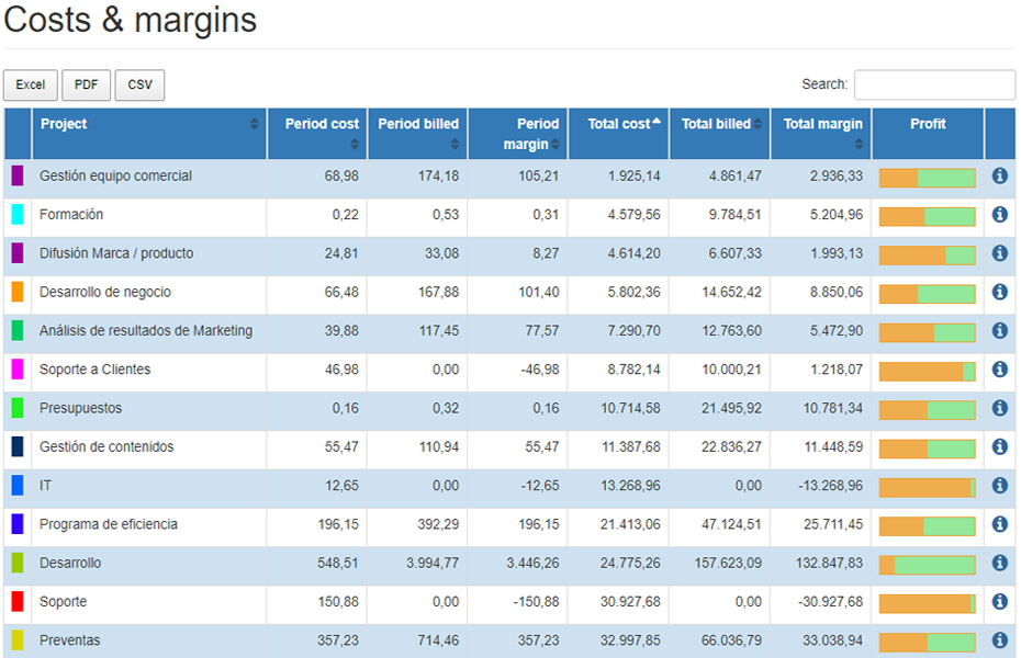With WorkProject you can calculate, in real time, the cost of your projects, the amount of billable hours and identify possible deviations from the forecasts.