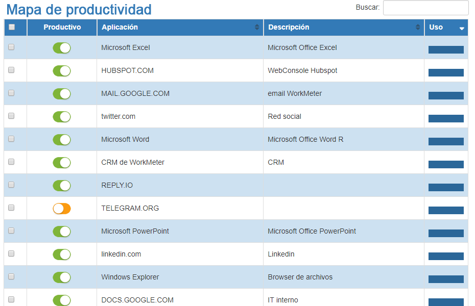 - Mapa de productividad: permite clasificar el listado de aplicaciones en productivas y no productivas por grupos o departamentos