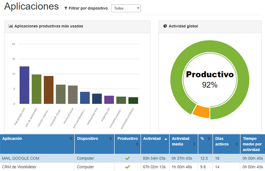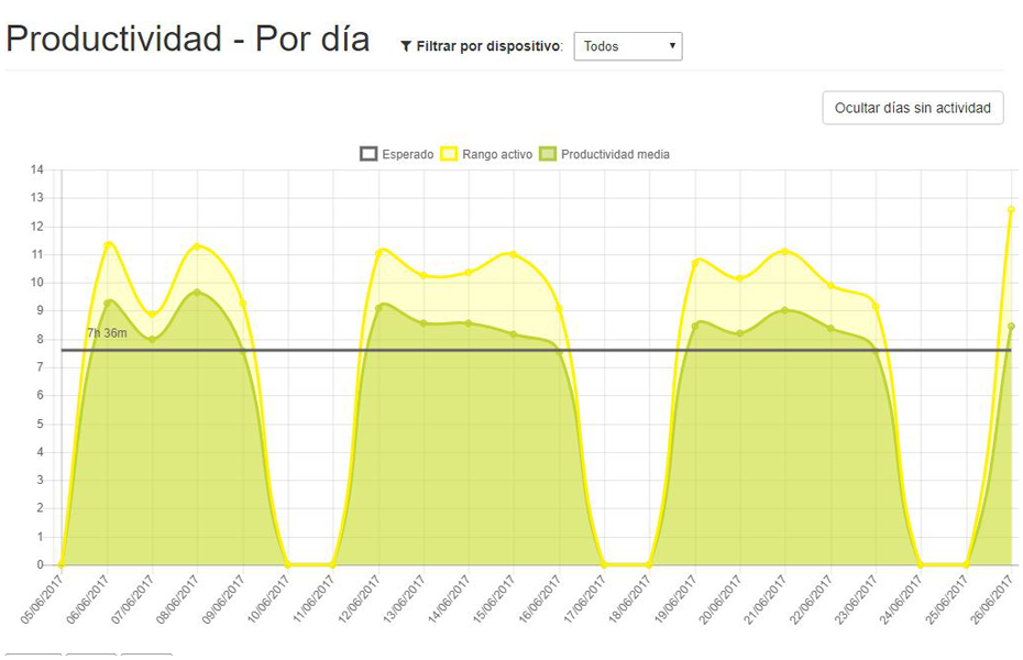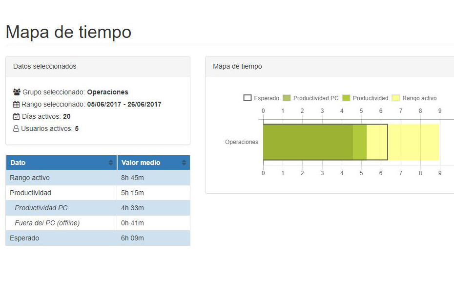 - Desglose del tiempo productivo entre trabajo en el PC y trabajo fuera del PC