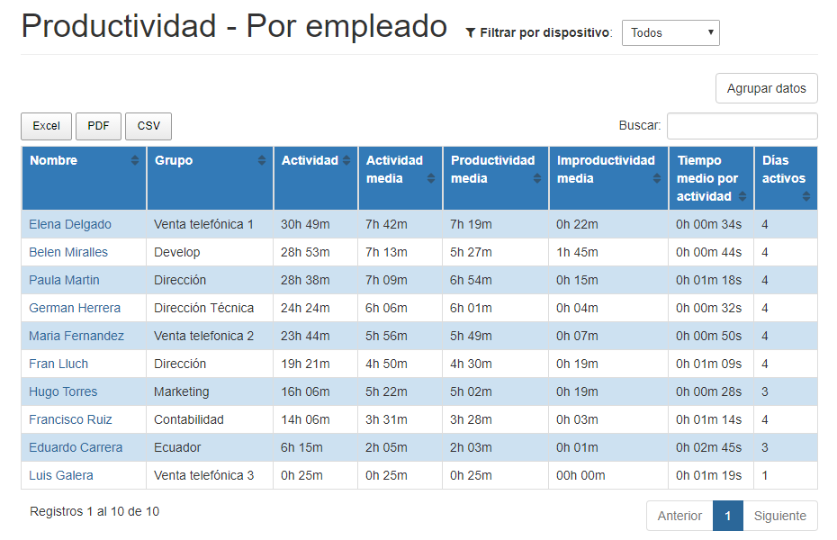 - Actividad VS productividad: EffiWork te permite identificar qué parte del tiempo activo es productivo y qué parte no lo es