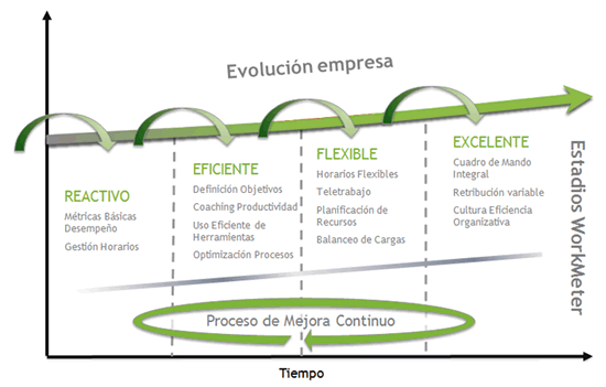 La filosofía de WorkMeter es fomentar una cultura de mejora continua y correponsabilidad en las organizaciones. En WorkMeter creemos firmemente que la medición de datos y la mejora continua no son un proceso más; es cultura de empresa. Un modelo a seguir. Por eso realmente pensamos que WorkMeter puede ayudarte a llevar a cabo un programa de mejora continua en tu compañía. Nosotros te recomendamos que en este programa de mejora continua participen tanto los mandos intermedios como el resto de personas del equipo ya que de esta forma conseguirás una mayor implicación y por extensión mejores resultados.