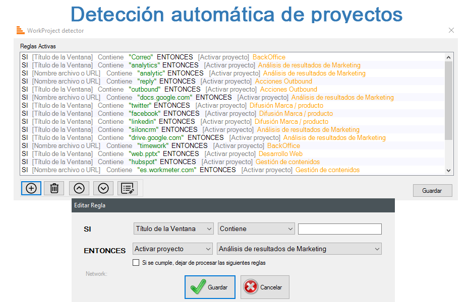 WorkProject es un software que mide el tiempo invertido en cada uno de tus proyectos. Es automático. Con su novedoso sistema de reglas condicionales, único en el mercado, permite detectar de forma automática en qué proyecto estás trabajando e imputar el tiempo al mismo de manera precisa. No hay errores ni olvidos, los datos obtenidos son 100% objetivos.