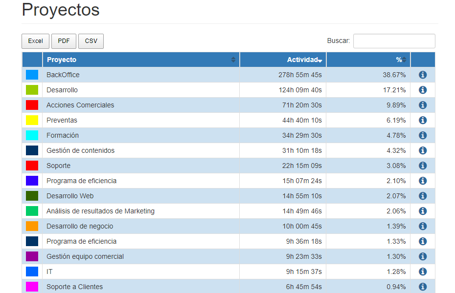 - Informe detallado de actividad por proyecto, por grupo de trabajo y por empleado