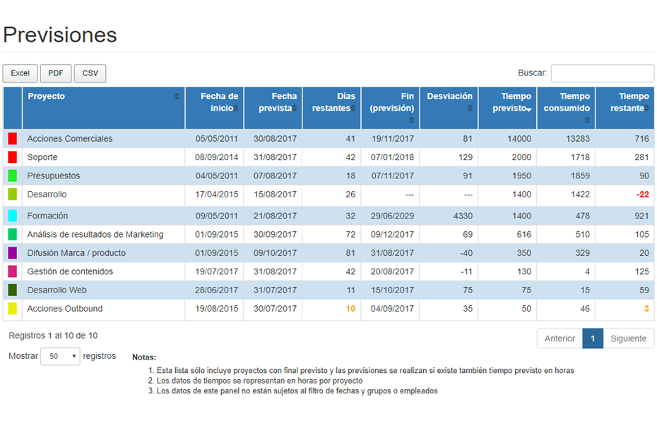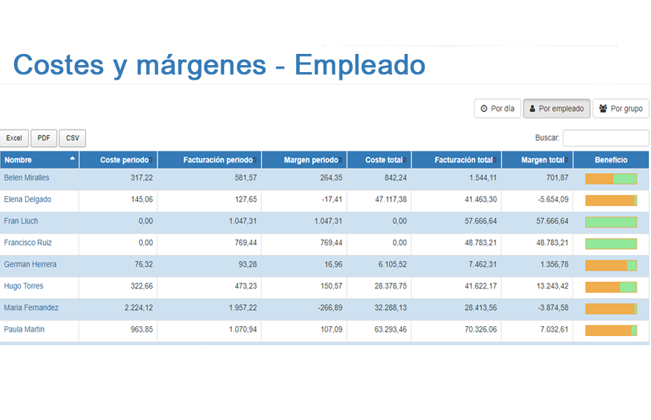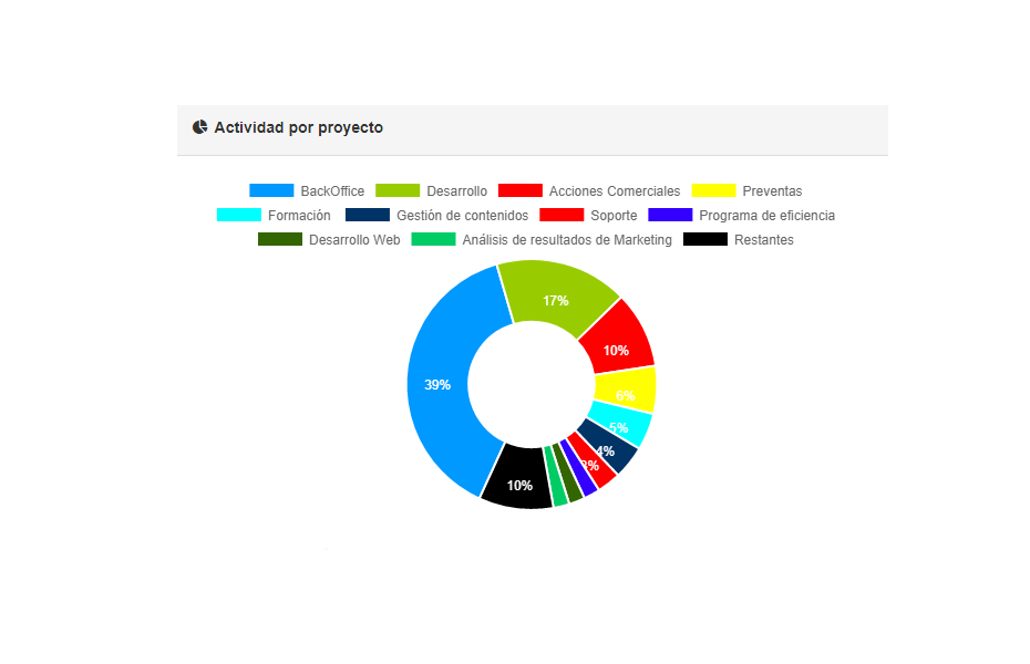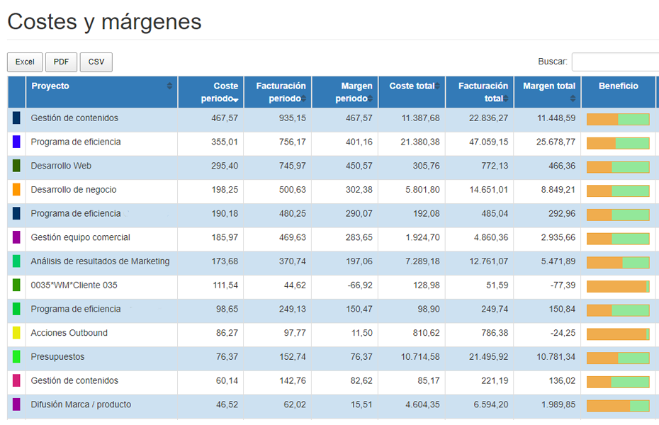 - Permite controlar en tiempo real cuánto tiempo se ha invertido en un proyecto y comprobar si la ejecución está alineada con las previsiones